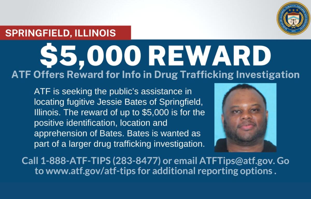 The Bureau of Alcohol, Tobacco, Firearms and Explosives is looking for a Springfield man and is offering a $5,000 reward for someone who can help law enforcement identify, locate and apprehend Jessie Bates. Bates is wanted as part of a drug trafficking investigation. Local and state police are working with the U.S. Marshals Service, FBI, and Department of Homeland Security on the case. To report an anonymous tip, use the Report It app or call 888-ATF-TIPS.