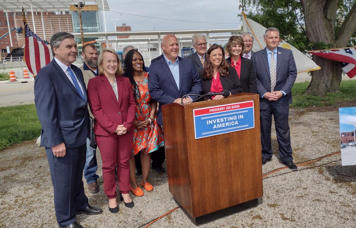 A group of dignitaries from government, business and labor converged on two downtown sites of note this Friday morning. The group was headlined by US Congresswoman, Nikki Budzinski, Mayor Misty Buscher and senior advisor to President Biden, Mitch Landrieu. They met first at the proposed site of a memorial dedicated to the 1908 Springfield Race Riot and view artifacts taken from the site. The group then moved onto the under-construction Springfield/Sangamon Transit Hub. After touring the facility Budzinski and Landrieu both spoke about the importance of the Hub in building a bridge between Springfield’s diverse communities.