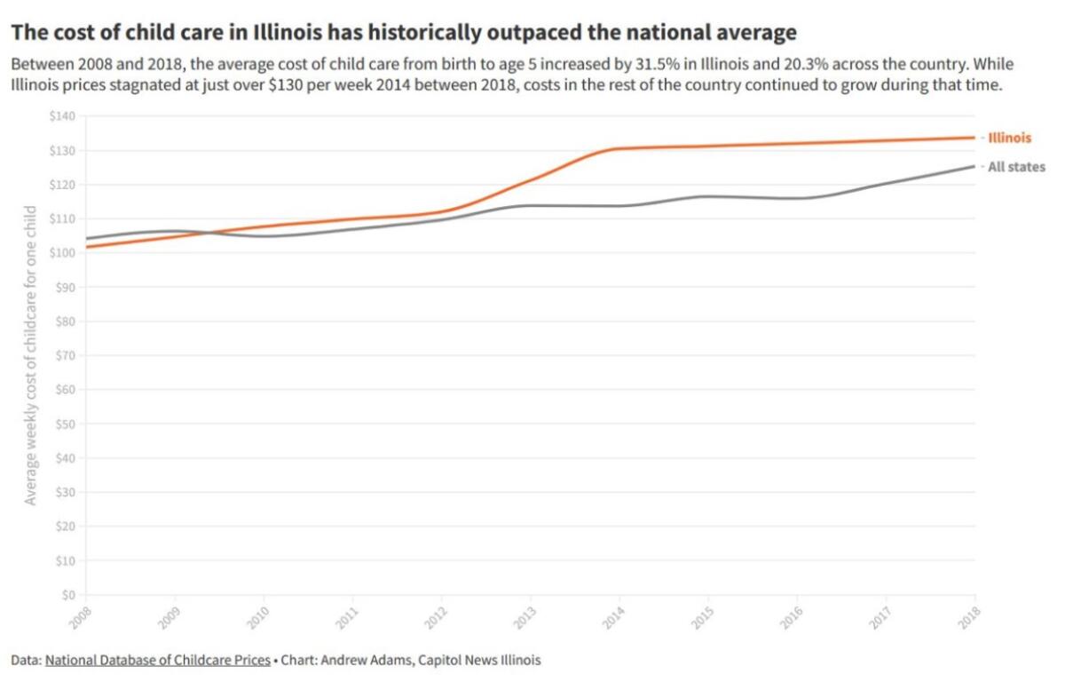 In 2018, the most recent year for which data is available, the average weekly cost of child care in Illinois was $133.69 per child, according to the National Database for Childcare Prices, a project of the federal Department of Labor. Fifty-two weeks of child care at the average cost in Illinois represents nearly 13 percent of the state’s median household income.