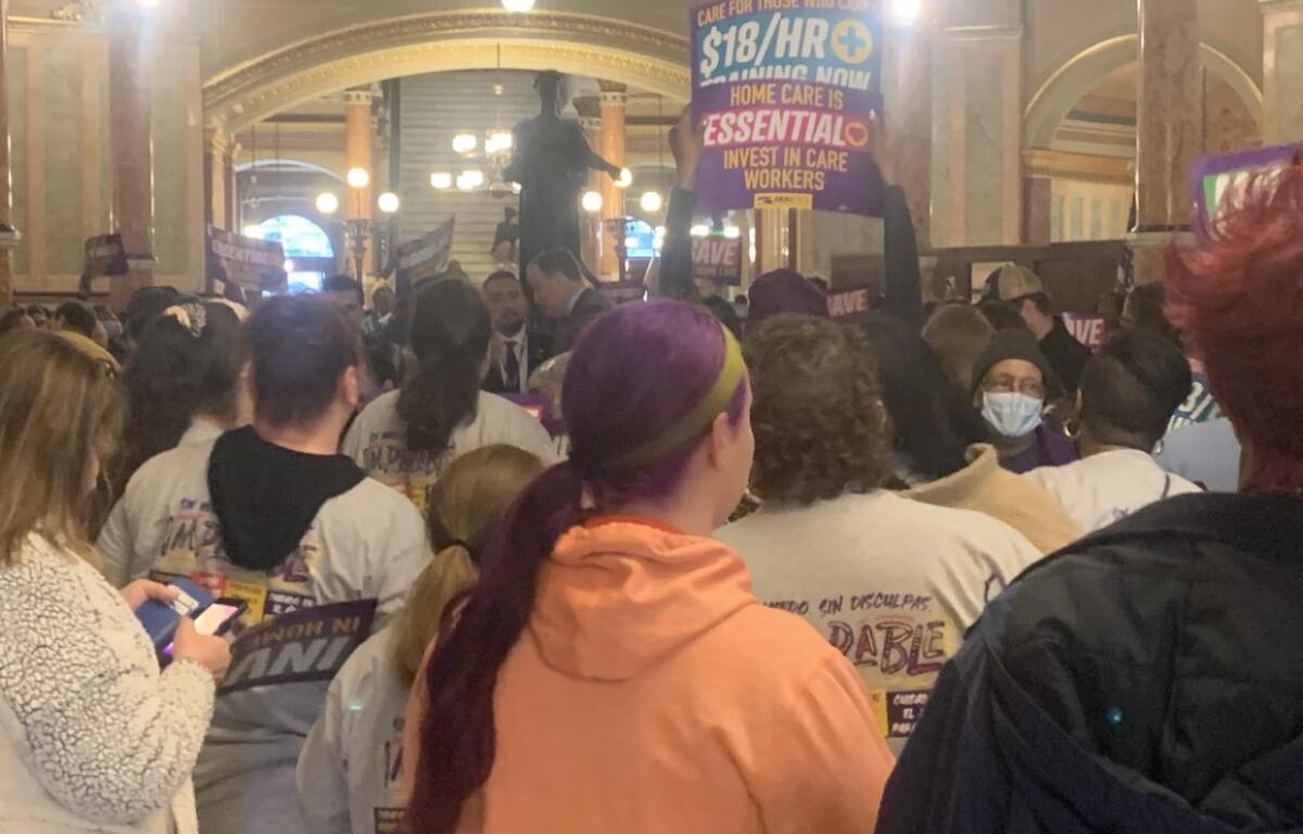In another sign that the pandemic is moving farther into the past, hundreds of union members crowded into the Capitol Rotunda Thursday to rally for higher wages for home care workers..