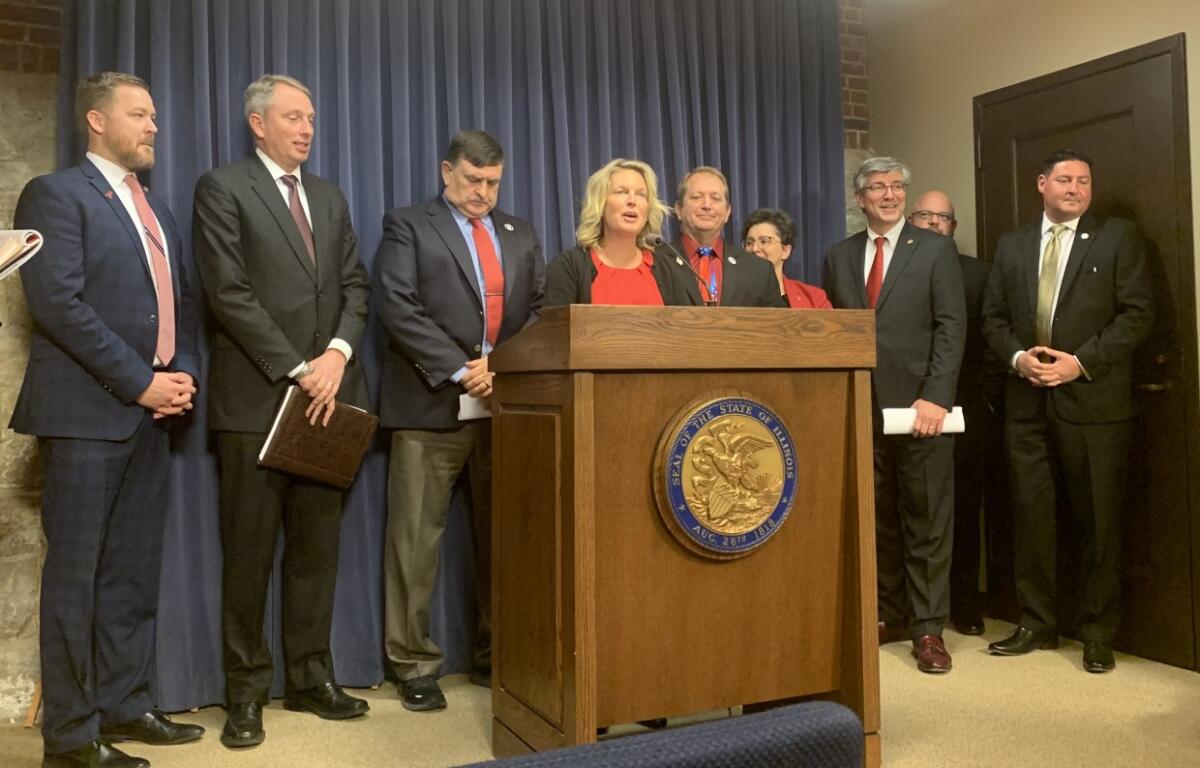 House Minority Leader Tony McCombie (at microphone) (R-Savanna), announcing House GOP working groups for areas as diverse as literacy and the economy, has said she is willing to work with supermajority Democrats, answering House Speaker Chris Welch’s (D-Hillside) “Yes we can” with “Yes we will.”