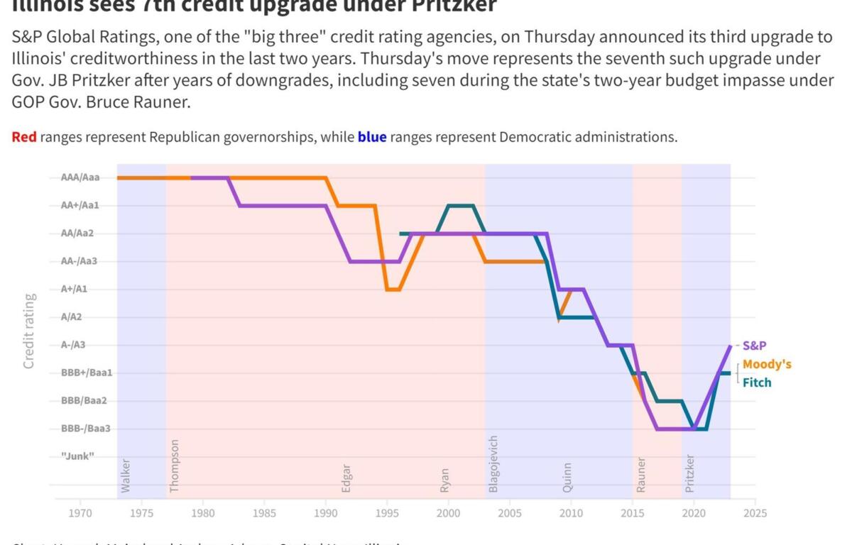 “I am thrilled to see our hard work at righting the past fiscal wrongs of our state reflected in today’s action by S&P with another credit rating upgrade – the third such upgrade in just two years,” Pritzker said in a statement. “Our continued fiscal responsibility and smart budgeting will save Illinois taxpayers millions from adjusted interest rates, and my partners in the General Assembly and I look forward to building on that success.”
