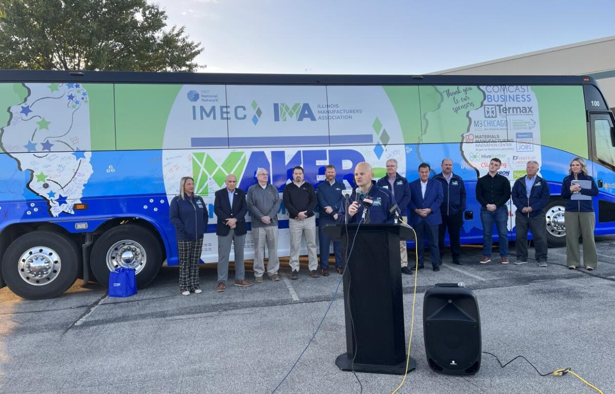 You just might see a big, 56-foot bus wrapped in blue and green, festooned with the logos of Illinois manufacturers. It’s the second annual “Makers on the Move” bus tour, put on by the Illinois Manufacturers’ Association and the Illinois Manufacturing Excellence Center.