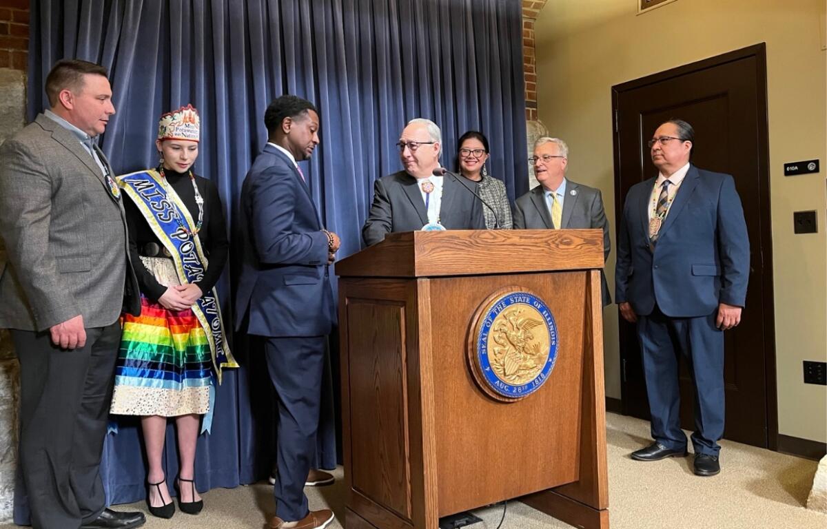 The Prairie Band Potawatomi Nation, chaired by Joseph Rupnick (pictured, at mic), says the federal government seized its land near DeKalb, in violation of treaties agreed to about 200 years ago with Rupnick’s ancestor, Chief Shab-eh-nay.