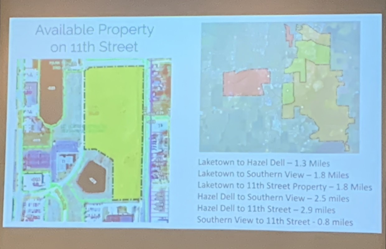 It’s undetermined where the new school, consolidating the current Hazel Dell, Laketown, and Southern View buildings, will be built. Superintendent Jennifer Gill did not give a reason for the district’s change of heart about the Eleventh Street site for a school.