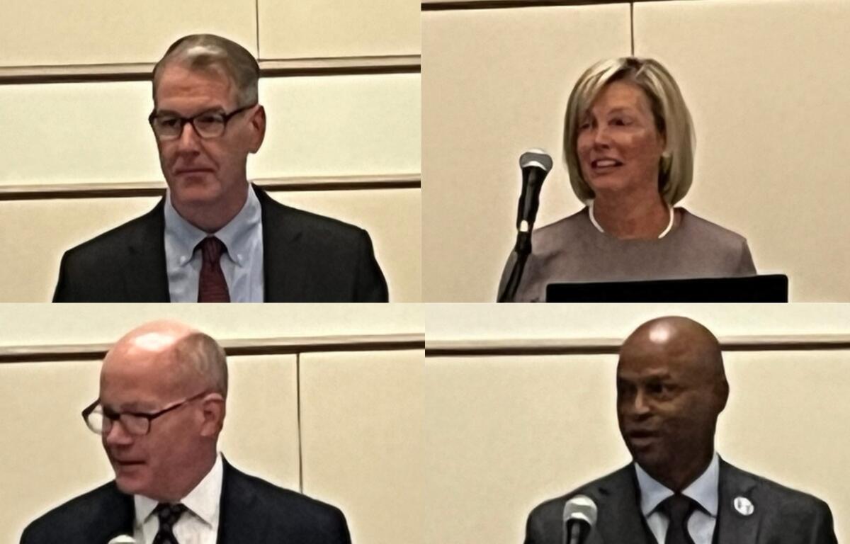 Senate President Don Harmon (pictured, lower left) (D-Oak Park), saying state government should be boring (“I want it to model itself after me!”) and get out of the way, praised Gov. JB Pritzker’s cheerleading for Illinois, but Senate Minority Leader John Curran (pictured, upper left) (R-Downers Grove) said Democrats are messing everything up: “The recent announcement that a large (Quaker Oats) plant in Danville will be closing its doors, resulting in more than 500 lost jobs in an area of the state that has a higher than average unemployment rate already, is a prime example of how we have to do a better job of taking care of our current employers here.”