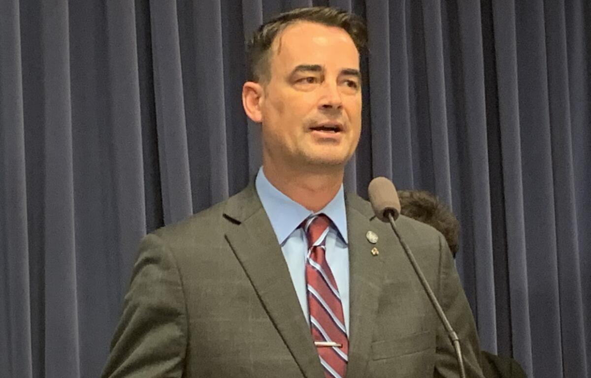 Illinois Republican Party Chairman Don Tracy speaks during the GOP Day picnic and rally at the Illinois State Fair on August 17, 2023.