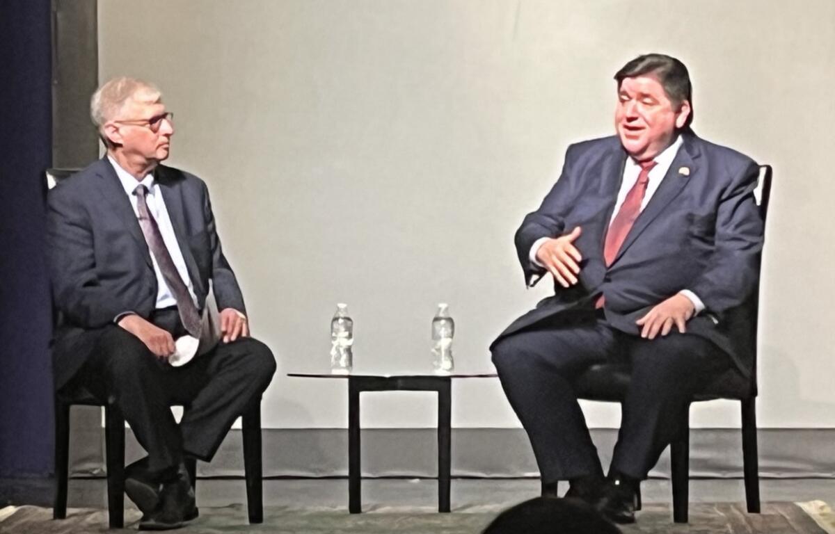 “You might say, well, gosh, it’s been so long, why hasn’t it happened?” Pritzker (pictured, right, with moderator Bernie Schoenburg) said Thursday at a Citizens’ Club of Springfield program. “Suffice it to say, we have left it to the city to tell us, what do you want? What do you want, and how can we help as a state?