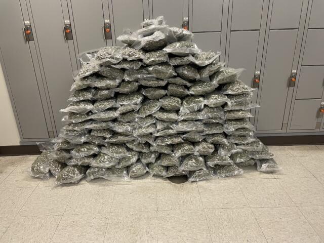 During a search of the vehicle, officers recovered over 100 pounds of cannabis, a loaded firearm, and a small amount of ecstasy.